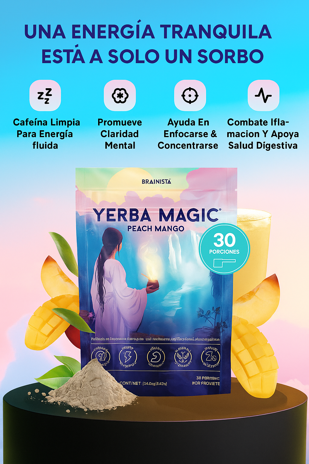¿Buscas energía sincera y sin bajones? Prueba Yerba Magic: 100 mg de cafeína vegetal, adaptógenos y sabor melocotón-mango que renuevan tu día.